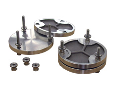 圧縮永久歪試験器 スポンジ、軟質ウレタンフォームなどの圧縮永久ひずみ試験に用いる圧縮装置です。 アルミニウム製のため軽量で、取り扱いが簡単です。 仕様 準拠規格 JIS K 6400 試験片寸法mm 1個掛 100×100×50 3個掛 50×50×50 可変スペーサmm 可変範囲 5~35 圧縮板 アルミニウム製 寸法mm φ200×高さ120 重量kg 3